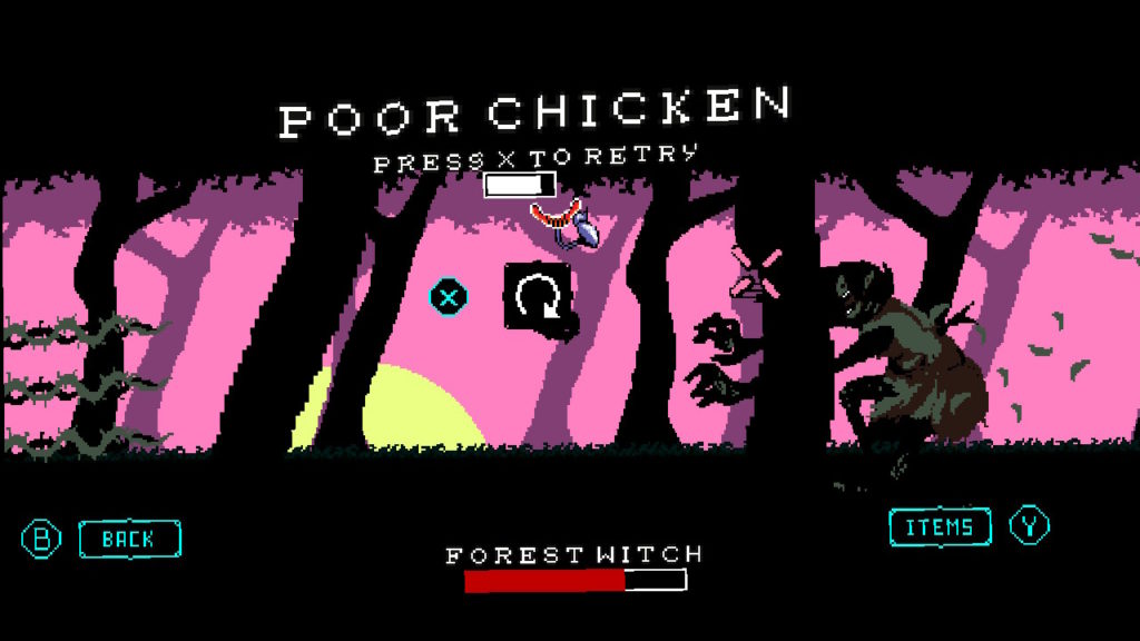 Beim ersten Boss gibt die derzeitige Begleiterin noch Tipps, wie Chicken dem Gegner, einem riesigen Fisch, am besten Schaden zufügen kann. Oft gibt es mindestens zwei Möglichkeiten, die nicht unbedingt beide sofort ersichtlich sind. Solange Chicken nicht stirbt, reicht es allerdings auch aus, überhaupt zu wissen, wann ich angreifen kann. In der Regel sind direkte Treffer möglich, solange der Boss auf dem Bildschirm ist. Bei einem der späteren Bosse brauchte ich mehrere Anläufe, in denen ich dachte, ich könne zeitweise nur ausweichen, bis ich herausgefunden habe, wo er verwundbar ist.