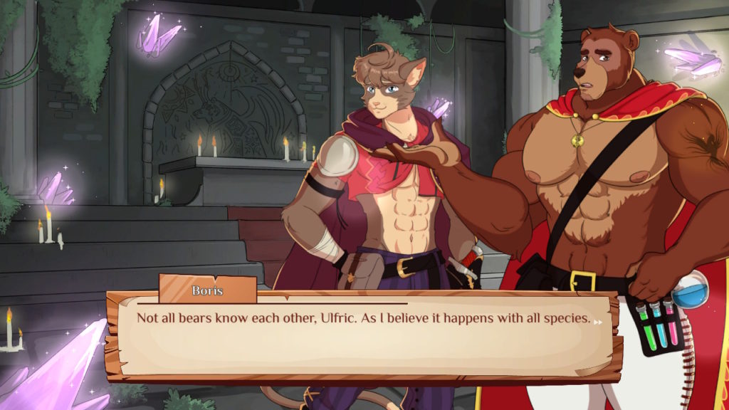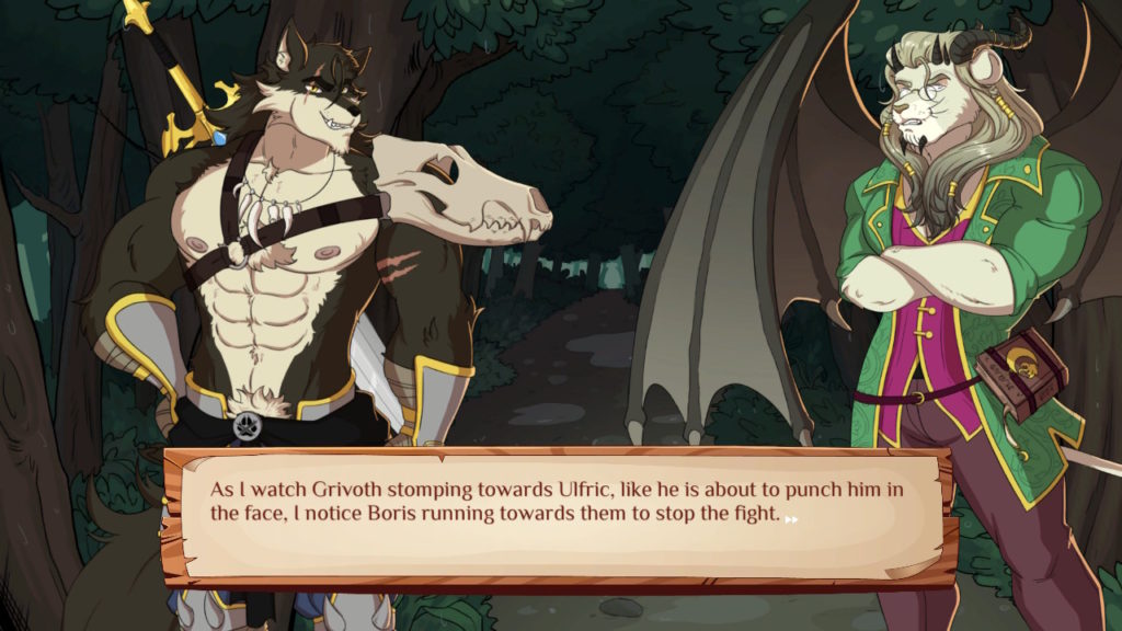 Die drei potenziellen Partner in Burrow of the Fallen Bear gehören unterschiedlichen Spezies an. Boris, der gutherzige Heiler, ist ein Bär und manchmal fast schon unheimlich nett. Söldner und Wolf Ulfric flucht in beinahe jedem Satz. Forscher Grivoth, halb Löwe, halb Drache, scheint sich für etwas Besseres zu halten. Alle wirken etwas stereotyp, doch die Charaktere haben alle ihre eigene Stimme. Diese kommt sogar in der englischen Übersetzung gut herüber, obwohl vereinzelte Fehler in den Texten sind und manche Sätze keinen Sinn ergeben.