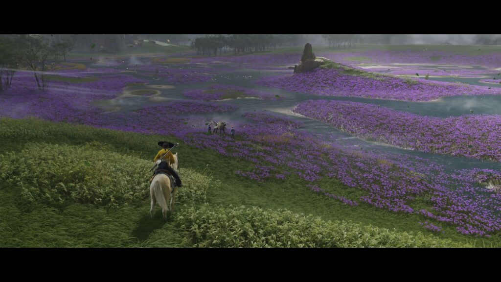 Manche Hauptgebiete sind durch Szenen oder kurze Ladezeiten getrennt, auch mancher Ort auf Bergen ist so etwas losgelöst vom Rest der Welt. Das ist aber kein großer Störpunkt für mich. Die einzelnen Gebiete sind wieder unterschiedlich genug gestaltet, was sich auch in der Flora zeigt. Von rosa beblüteten Bäumen über Herbstfarben und schneebedeckte Bäume ist quasi das ganze Jahr abgedeckt, was zugegeben zum gleichen Zeitpunkt nicht unbedingt realistisch ist. Große Felder gleichfarbiger Blüten bieten wieder schöne Ansichten.
