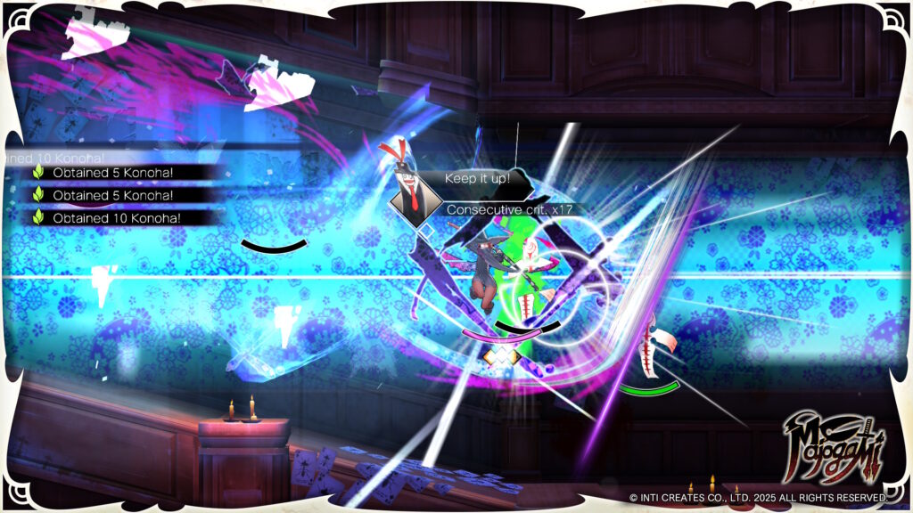 Shiroha kann aber auch magisches Papier für Setsuna-Angriffe nutzen, die horizontal, vertikal oder diagonal ausgeführt werden können. Die richtige Richtung ist oft zum Zerstören von gegnerischen Schutzschilden nötig, weshalb man die mächtigen Angriffe nicht zu wild einsetzen sollte. Da man aber beim Besiegen von Gegnern mehr magisches Papier erhält als durch normales Angreifen, kann man teils einige Setsuna-Angriffe aneinanderreihen und viele normale Gegner in schön schneller Folge besiegen.