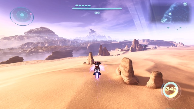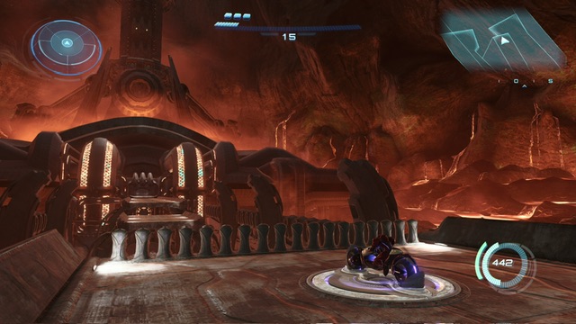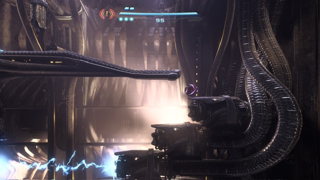 Die Wüste ausgeschlossen sind die einzelnen Dungeons absolute Klasse, das Leveldesign ist hervorragend, auch wenn ich mir unter einem Metroid Prime eigentlich immer vorgestellt habe dass ich mich wie in den Ablegern in 2D dauernd verlaufen oder nach dem richtigen Weg suchen würde. Das war glücklicherweise für mich eher selten der Fall, die Levels waren eher linear mit einzelnen Abzweigungen und wenn ich mal was Tolles gefunden habe kam ich nicht dran, weil mir die entsprechende Fähigkeit gefehlt hat, aber das erwarte ich bei einem Metroidvania auch nicht anders. Aber diese Wüste… Irgendwann hat es mich einfach nur noch genervt die Wüste zu durchqueren, natürlich findet man auch hier Geheimnisse wie einzelne Schreine die Verbesserungen beinhalten, aber immer wieder von A nach B zu fahren um dann wieder nach A zu fahren um dann wieder nach C… Immerhin hat man mit Vi-o-La ein Motorrad, das die Wege kürzer macht, aber mir hätte das Spiel ohne die Wüste wesentlich besser gefallen. Nur als kleiner Tipp nebenbei: Man sollte die grünen Kristalle auf dem Weg immer mitnehmen, denn diese werden am Ende essentiell sein. Ansonsten bieten die Biome genügend grafische Abwechslung und tolle Endgegner. Auch das Upgradesystem hat mir gut gefallen, neben den Upgrades für den Morphball und Raketen gibt es auch drei verschiedene Elementarschüsse, die unter anderem für Rätsel gebraucht werden, aber auch in Kämpfen das Leben stark erleichtern können.