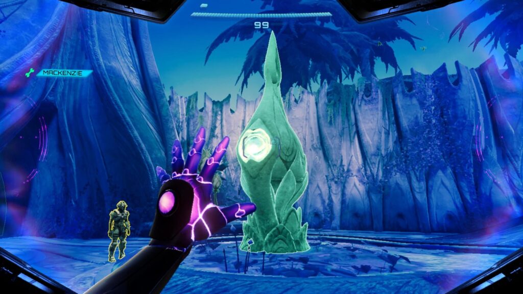 Samus Aran hat in Metroid Prime 4 nämlich die Möglichkeit, telekinetisch auf bestimmte Objekte einzuwirken. Teilweise wird das auf recht unspektakuläre Weise genutzt, wenn man beispielsweise einfach ein Symbol nachzeichnen muss. An anderen Stellen wird es aber auch auf sinnvolle Weise genutzt, beispielsweise um eine abgelegte Powerbombe aufnehmen und auf ein Ziel zu werfen, das man mit dem Morph Ball nicht oder nur schwer erreichen kann. Das Potenzial der psychischen Fähigkeiten wird zwar nicht ganz ausgeschöpft, sorgt aber bei den altbekannten Fähigkeiten für eine willkommene Varianz.