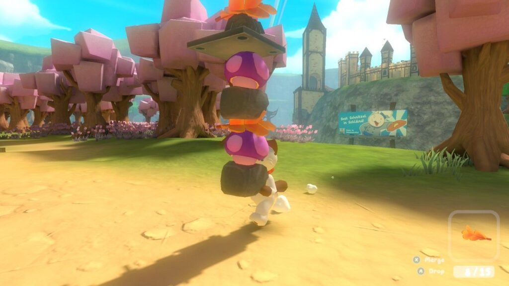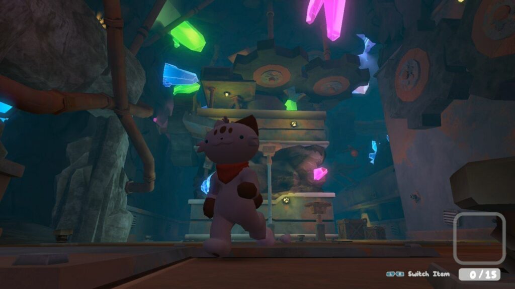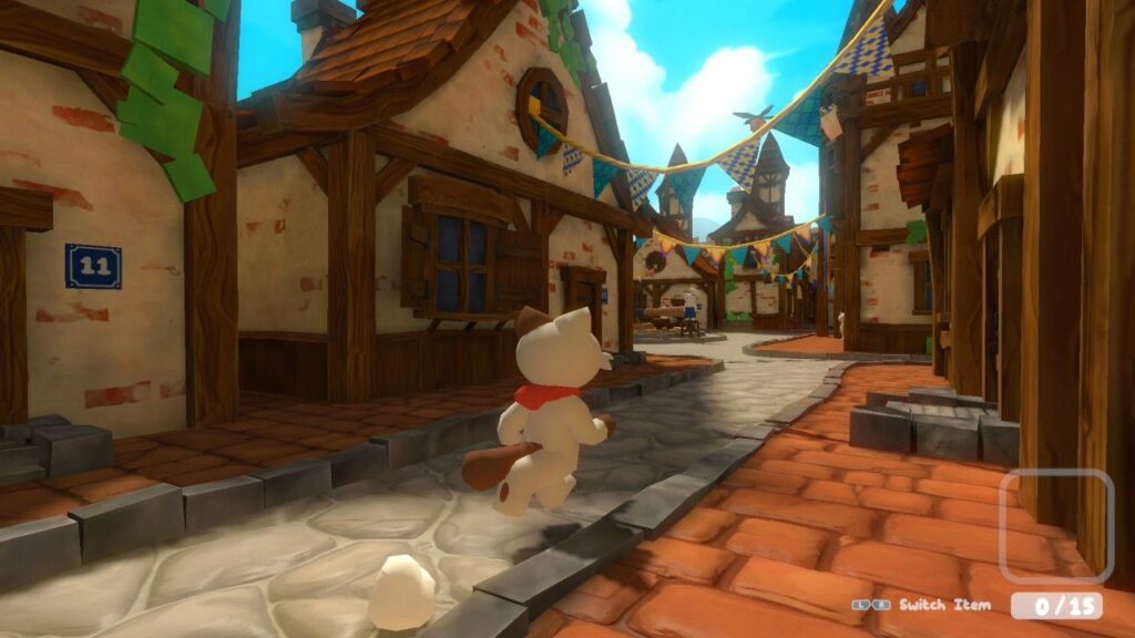 Hierzu muss man in der komplett offen gestalteten Welt von Super Chipflake Ü allen möglichen anderen Katzen ihre Wünsche erfüllen, in der Hoffnung, die wertvollen Zutaten zu ergattern. Neben Springen und Rennen, den Pflichtfähigkeiten eines jeden Jump & Runs, kommt Super Chipflake Ü aber noch mit einer eher ungewöhnlichen Idee daher. Man kann nämlich alle möglichen Objekte im Spiel aufheben und vor sich hertragen. Neben den Zutaten zum Schnitzel Wiener Art können das beispielsweise Vasen, Honigwaben oder Stöcke sein. Diese Gegenstände kann man anderen Leuten bringen und ihnen so eine Freude bereiten, oder aber sie mit Druck auf den X-Knopf kombinieren. Auf diese Weise kann man einige sehr hilfreiche Utensilien erhalten, die einem den Weg durch die offene Welt bahnen können. Zum reinen Abschluss des Spiels ist die Kombinationsfähigkeit zwar nicht allzu wichtig, aber wer alle zusätzlichen Aufgaben erledigen und ein volles Stickerbuch haben möchte, der sollte sich doch mit der Mechanik auseinandersetzen.