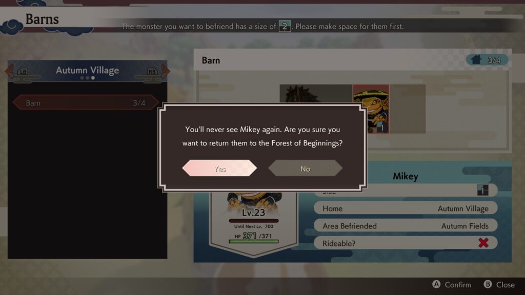 Im Spielverlauf erhält man auch die Möglichkeit, Monster zu zähmen und als Gruppenmitglied zu wählen. Manche kann man sogar reiten. Ich habe aber Charaktere bevorzugt, die beim Erkunden und Kämpfen auch noch Punkte für die Freundschaft erhalten. Für gezähmte Monster benötigt man Scheunen, erhält dann aber regelmäßig auch Items. Selbst wenn man sie nicht zum Kämpfen nutzt, kann das Zähmen also hilfreich sein.