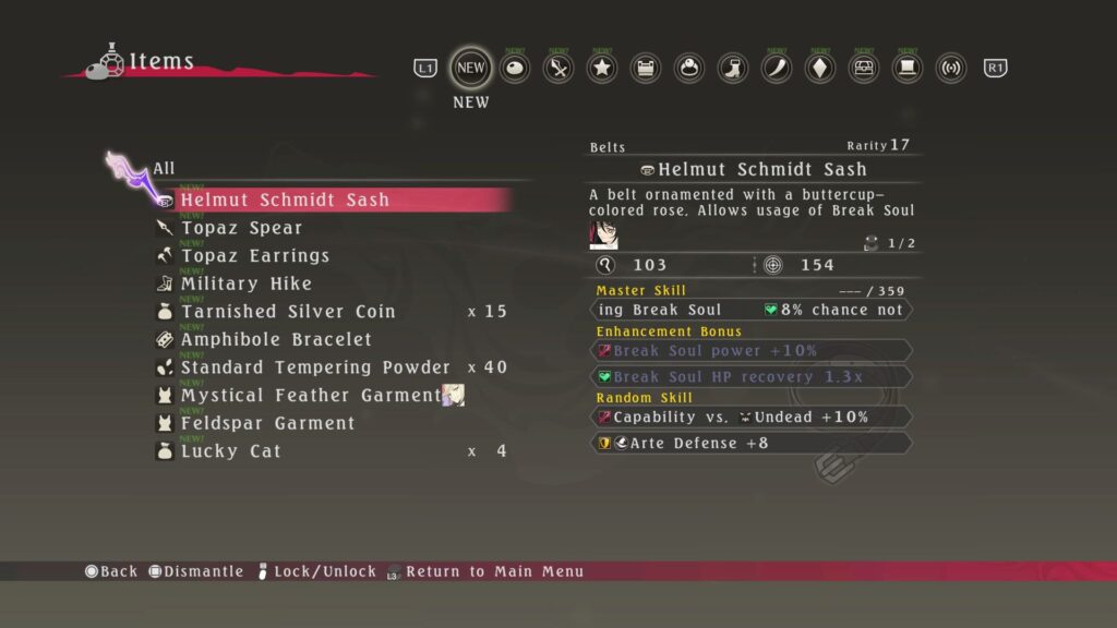 Das Zuweisen der verschiedenen Artes je nach Gegnern ist natürlich nicht alles, was man vorbereitend machen kann. Es gibt jede Menge Ausrüstung zur Auswahl. Fast jeder Gegner hat sogar ein eigenes Ausrüstungsstück als mögliche Beute. Natürlich ist spätere Ausrüstung tendenziell stärker, aber auch die Ausrichtung der Statuswerte kann sich stark unterscheiden. Zudem hat jedes Ausrüstungsstück einen Master Skill, den der Charakter für sich lernen kann, indem er mit der Ausrüstunggenug kämpft.