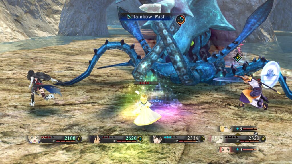 Bis zu vier Charaktere nehmen gleichzeitig am Kampf teil. Hier kann man standardmäßig Kombos mit bis zu vier Artes hintereinander einsetzen, die jeweils mit einem der vier Facebuttons gewählt werden. Die Artes für die vier Knöpfe und Kombostufen kann man im Menü zuweisen. Je nach Schwierigkeitsgrad ist das unterschiedlich wichtig. Da Artes unterschiedliche Elemente haben können und oft stark gegen bestimmte Gegnerkategorien sind, habe ich manchmal je nach Gebiet Anpassungen vorgenommen. Zumal jeder getroffene Schwachpunkt den Schadensmultiplikator erhöhrt.