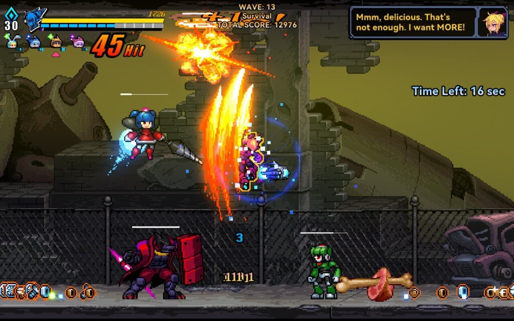 Das Kampfsystem von Super Alloy Crush macht Spaß, ist zugänglich und recht schnell. Allerdings kann es je nach Spielmodus vorkommen, dass gerade manche besondere Gegner und Bosse viele Treffer einstecken können. Wer möchte, kann aber per „Custom“-Einstellung gegnerische HP und Angriff in zehnerschritten von 10% bis 200% umstellen. Eine geringere Angriffskraft hat übrigens keine Auswirkung auf Trefferefekte, der eigene Charakter wird also trotzdem genauso leicht unterbrochen oder gar für mehrere Sekunden gestunnt.