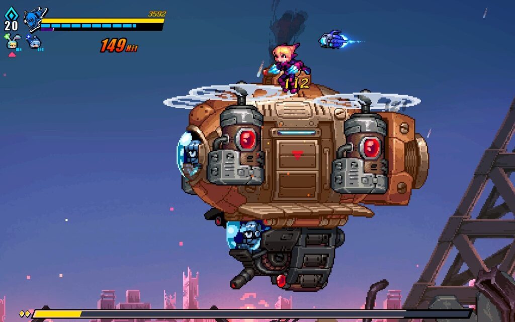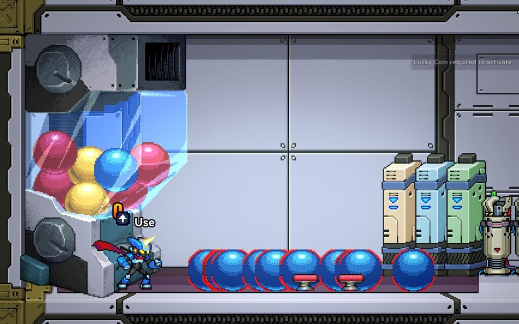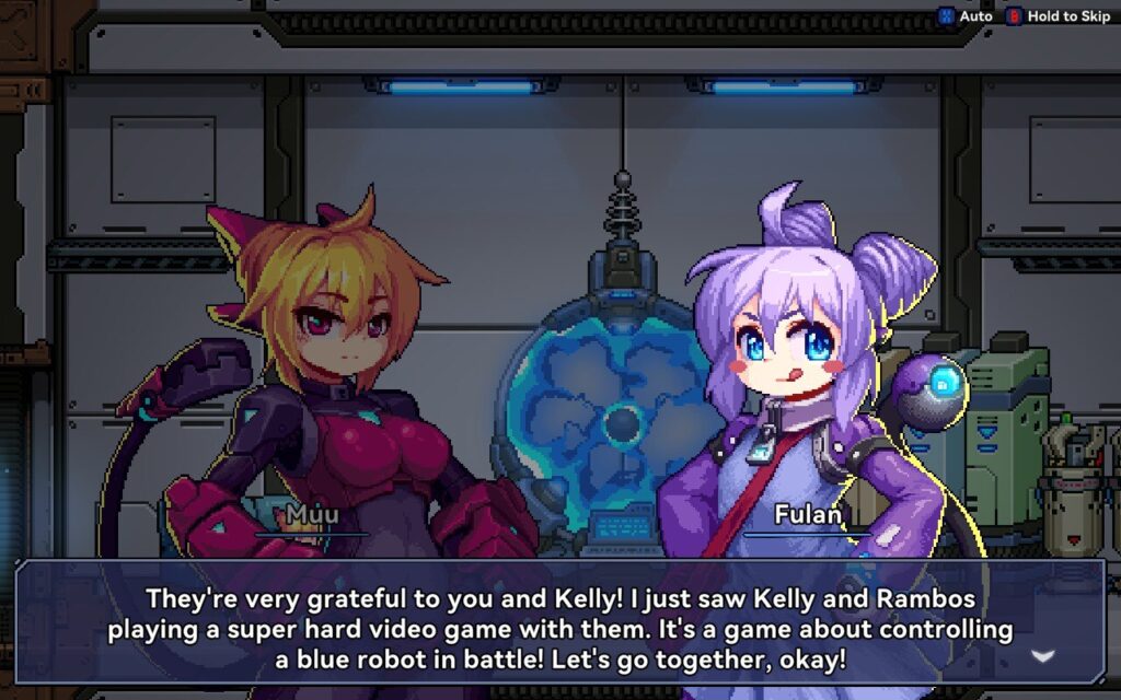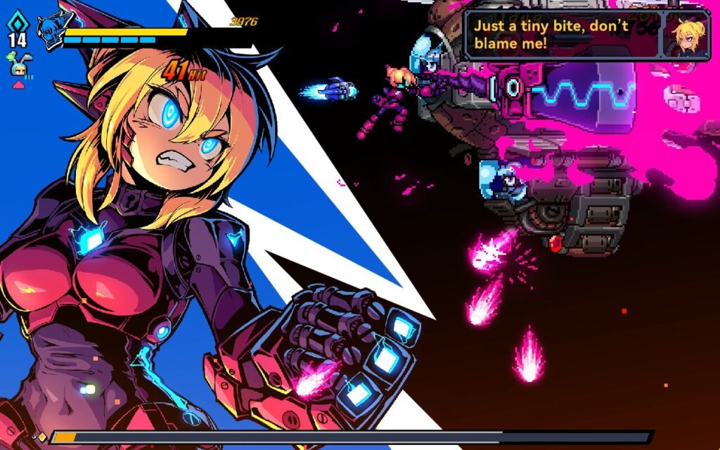 Im Vordergrund steht bei Super Alloy Crush nämlich nicht die Geschichte, sondern 2D-Action. Kelly und Muu unterscheiden sich dabei. Während Levels kann man nicht tauschen, aber im Schiff als Basis und beim Laden eines Speicherstands beziehungsweise dem Spielstart.
