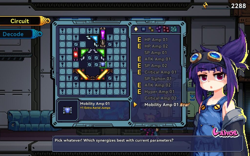 Im Schiff kann man sich zwischen Levels vorbereiten. Man kann bis zu vier erlernte Skills verschiedenen Eingaben zuordnen. Außerdem kann man auf den Schaltkreis von Kelly oder Muu Chips einsetzen, wenn man genug Platz in der richtigen Form hat. Weitere Stellen schaltet man mit Geld frei, das man hauptsächlich in verschiedenen Modi abhängig von der Punktzahl erhält. Allerdings wird jeder weitere Platz teurer, und manche Stellen sind erst durch den Abschluss bestimmter Charakterziele verfügbar. Schrauben lassen sich nicht entfernen, schließlich soll der Schaltkreis nicht abfliegen.