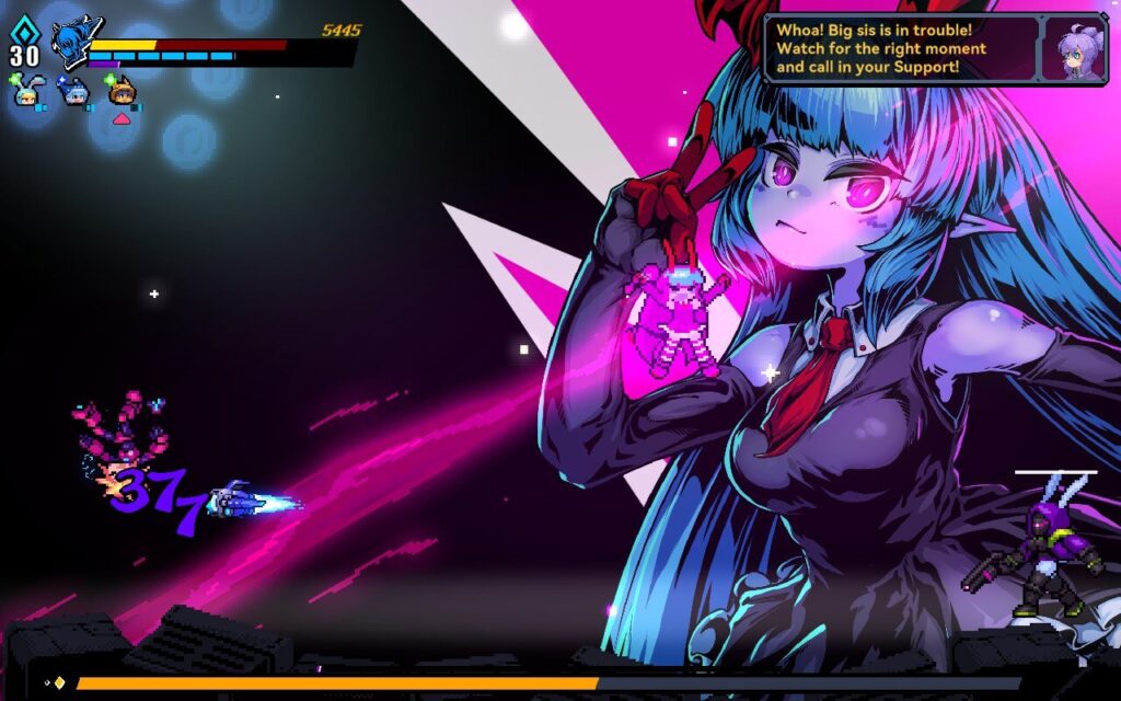 Superangriffe gibt es dann auch noch, wenn man durch Kämpfen und bestimmte Items genug EP angesammelt hat. Diese haben auch eine kurze Einblendungen mit Charakterillustration. Vereinzelte Bosse haben auch eine Abwandlung davon, wenn auch mit genug Vorwarnung statt instantan wie beim Spieler. Auch deren EP-Leiste ist zu sehen. Daneben haben sie etwas komplexere Angriffsmuster als Standardgegner, werden bisher aber nicht zu kompliziert.