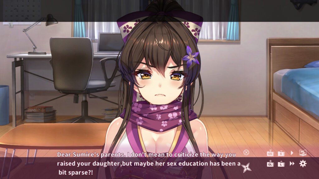Im Spielverlauf erlebt man dann diverse Ausschnitte aus dem Zusammenleben. Sumire ist ein fähiger Ninja und gut gebaut, besitzt aber auch eine gewisse niedliche Unschuld und Naivität. Manchmal ist sie auch ungeschickt und muss vieles über die moderne Welt erst lernen. Sie wurde offenbar nicht besonders vorbereitet auf ihre Mission, die Stadt kennen zu lernen um sich darin unauffällig aufhalten zu können. Oder ist die Unwissenheit etwa Teil des Trainings, um besser mit unbekannten Situationen klarzukommen? Der Protagonist ist aber nachsichtig und geduldig.