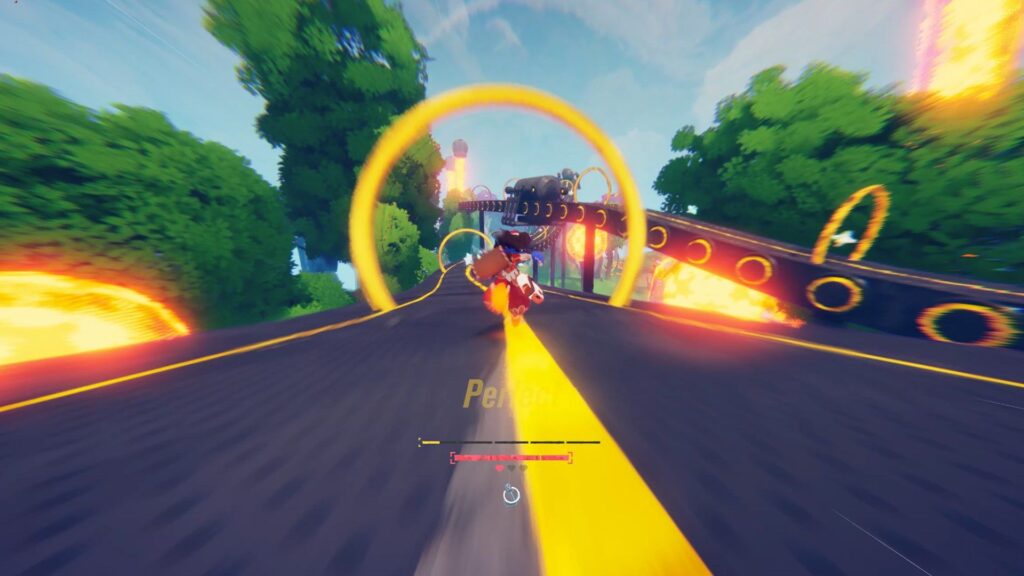 In der Luft hat man dann zwei Aktionen zur Verfügung. Einerseits kann man mit RT absinken, andererseits mit LT – sofern man Boostenergie zur Verfügung hat – boosten. Mit dem Boost verlängert man insbesondere die Zeit in der Luft. Die Landung wird anschließend dahingehend bewertet, wie sich der Winkel der Spielfigur im Vergleich zu der Steigung des Bodenpunktes verhält, auf dem man aufkommt. Je gleichmäßiger die beiden sind, desto besser. Gute Landungen werden mit einem Geschwindigkeitsvorteil, Boostenergie und, wenn man entsprechende Zusatzeffekte ausgerüstet hat, möglichen weiteren Belohnungen wie Lebensenergie goutiert.